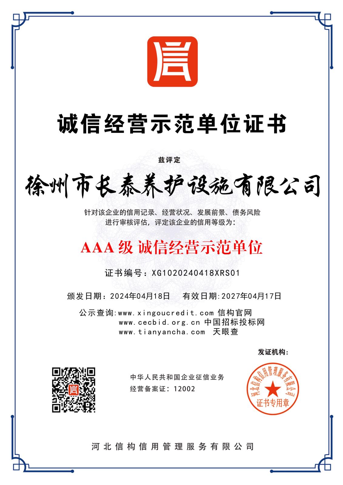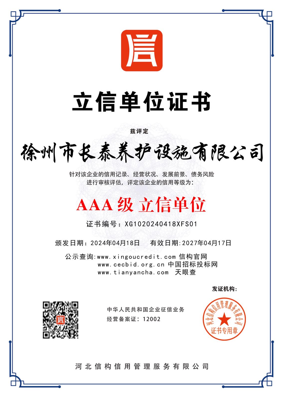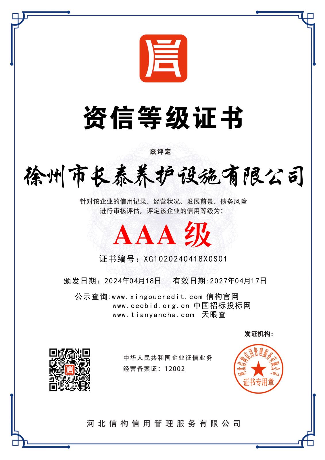 徐州長(zhǎng)泰養(yǎng)護(hù)設(shè)施有限公司3A信用