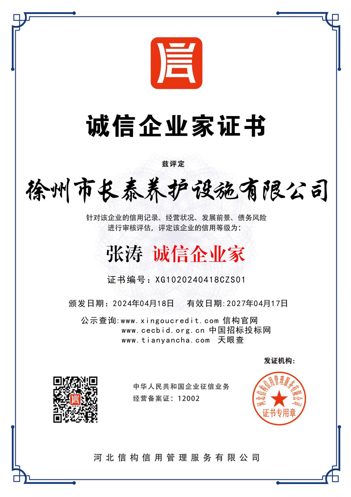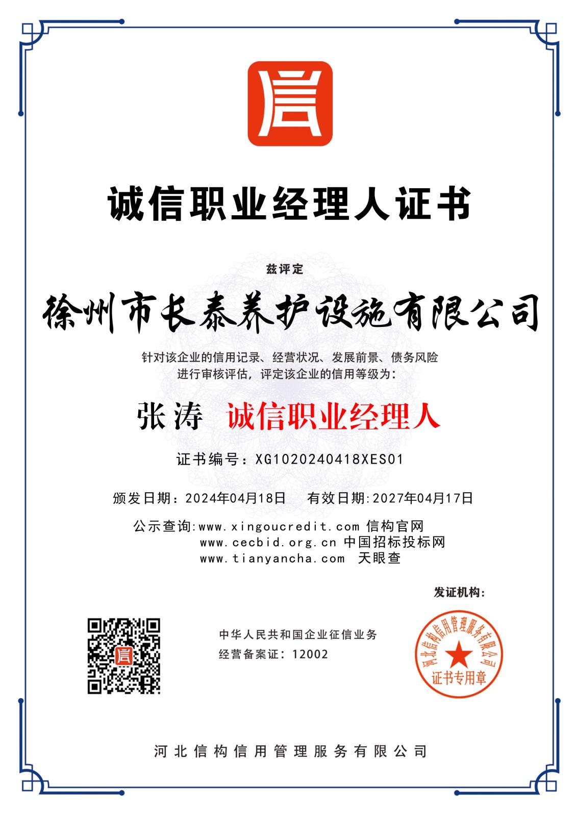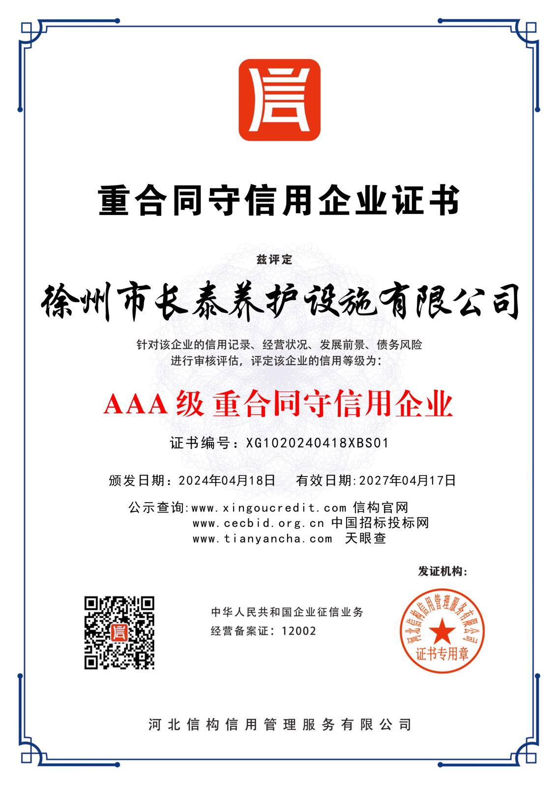 徐州長(zhǎng)泰養(yǎng)護(hù)設(shè)施有限公司3A信用